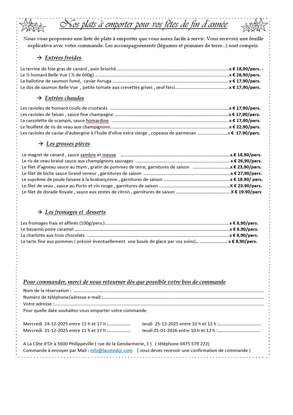 Sur simple demande , La liste évolue selon les saisons , sur simple demande nous pouvons vous envoyer une liste de plats que vous pouvez emporter